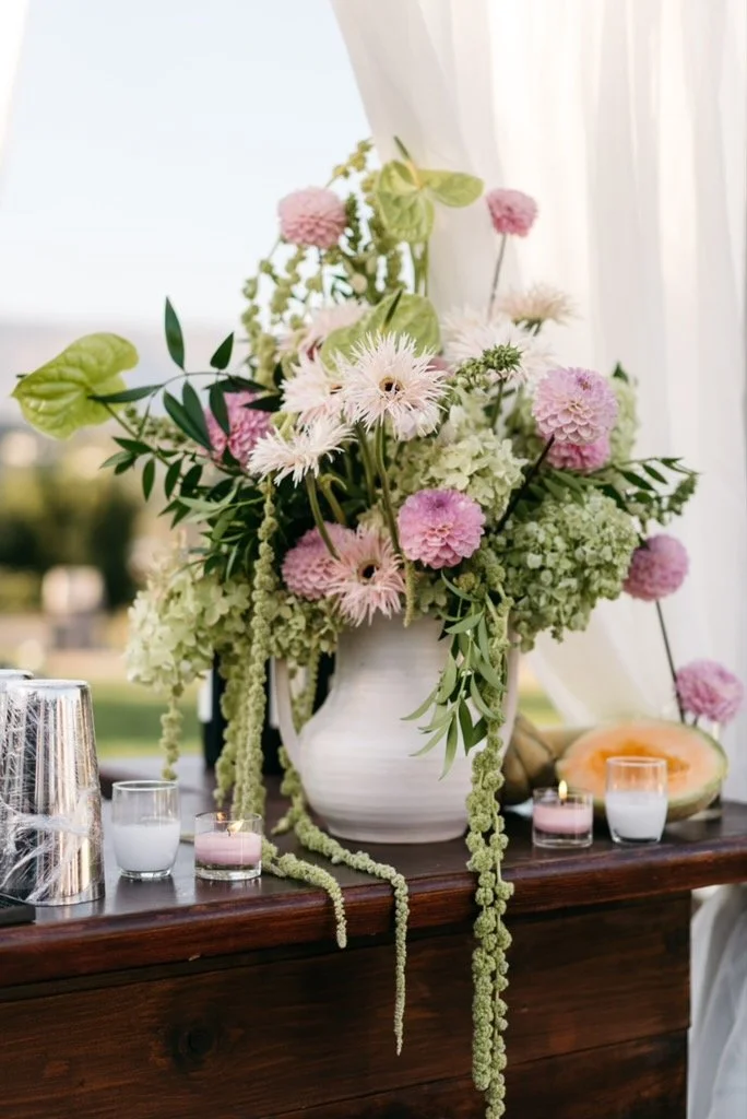 Our Approach: We introduced tons of luxe florals such as anthuriums, antique hydrangea, amaranth and fruit details. We incorporated a lot of personal details like custom embroidered ribbons, sourced custom pedestals and vessels, pearl pears and bow floral arrangements.