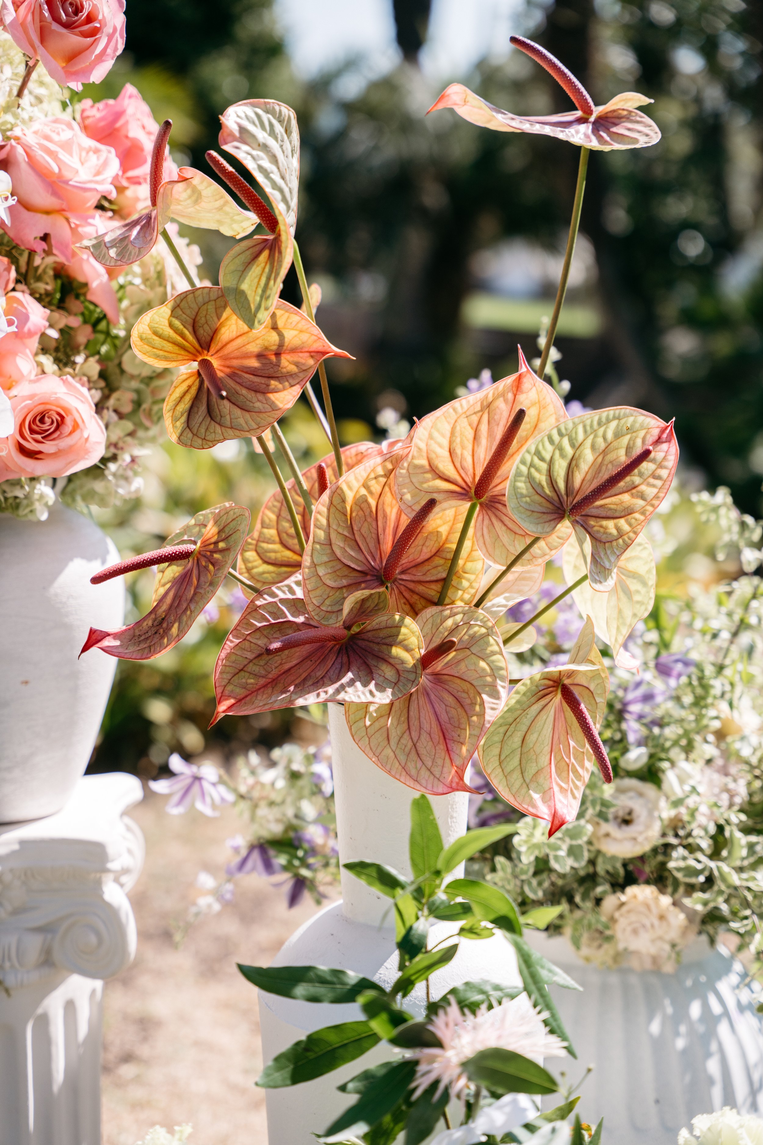 Our Approach: We created an immersive tropical atmosphere using specialty orchids, bamboo elements and bold color moments that photographed beautifully against the venue's lush backdrop. Throughout the wedding we played ultra-luxe tropical specialty blooms like painted birds of paradise, monstera, gloriosa, banana fruit and exotic anthuriums.
