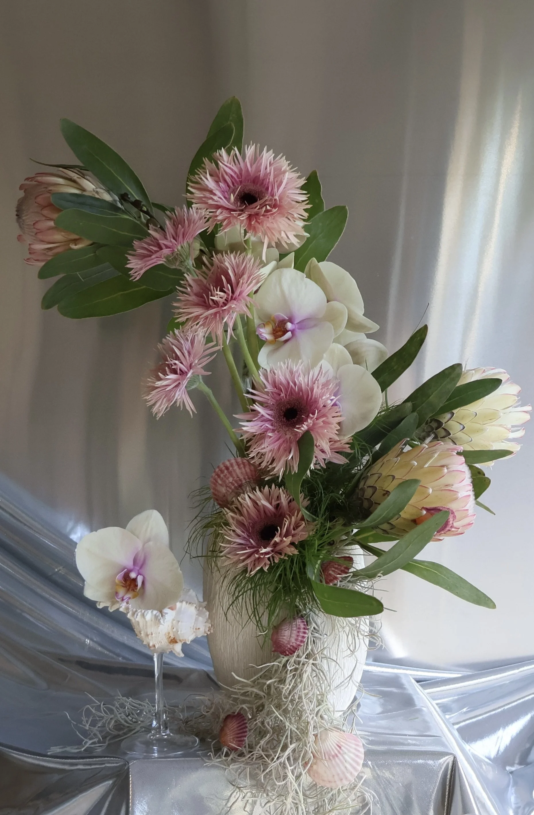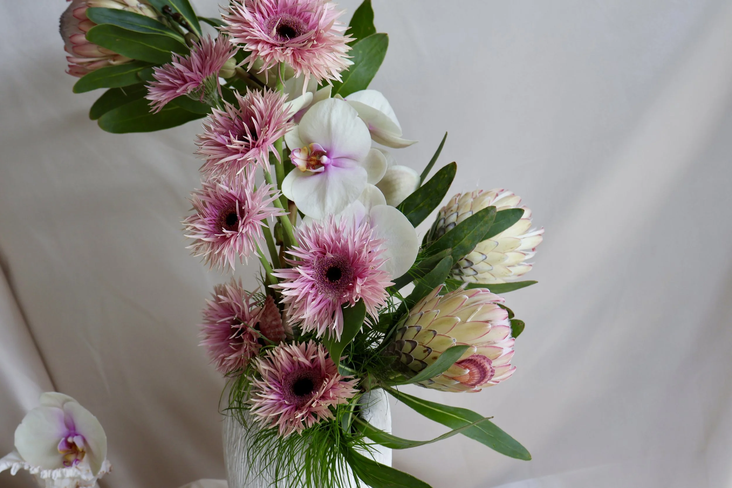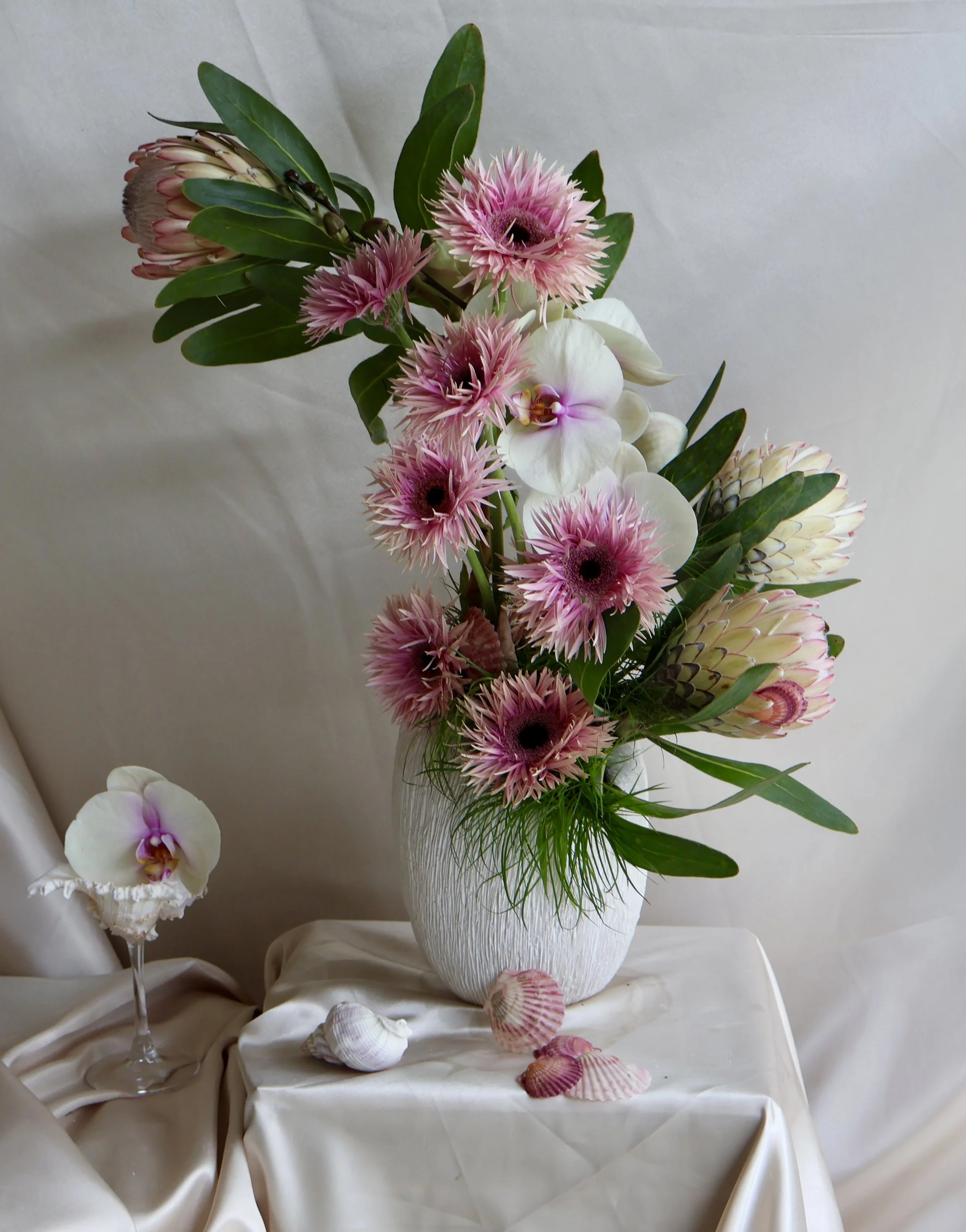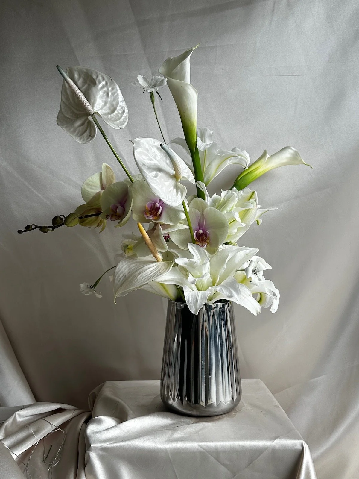 This elevated arrangement is anything but ordinary — layered with seasonal textures and softly sculpted form. Expect elevated blooms like anthuriums, dahlias, pincushions, and sweet peas — curated to feel both relaxed and indulgent. Approximate size 18’ tall x 16” wide